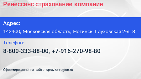 Ренессанс страхование, компания по адресу 142400, Московская область, Ногинск, Глуховская 2-я, 8 в дальнейшем Организация, размещена в следующих категориях:
