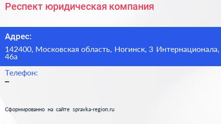 Респект, юридическая компания по адресу 142400, Московская область, Ногинск, 3 Интернационала, 46а в дальнейшем Организация, размещена в следующих категориях: