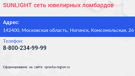 SUNLIGHT, сеть ювелирных ломбардов по адресу 142400, Московская область, Ногинск, Комсомольская, 26 в дальнейшем Организация, размещена в следующих категориях: