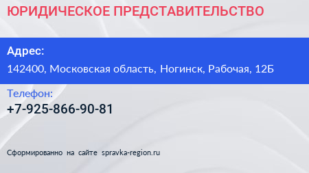 ЮРИДИЧЕСКОЕ ПРЕДСТАВИТЕЛЬСТВО по адресу 142400, Московская область, Ногинск, Рабочая, 12Б в дальнейшем Организация, размещена в следующих категориях: