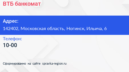 ВТБ, банкомат по адресу 142402, Московская область, Ногинск, Ильича, 6 в дальнейшем Организация, размещена в следующих категориях: