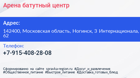 Арена, батутный центр по адресу 142400, Московская область, Ногинск, 3 Интернационала, 62 в дальнейшем Организация, размещена в следующих категориях: