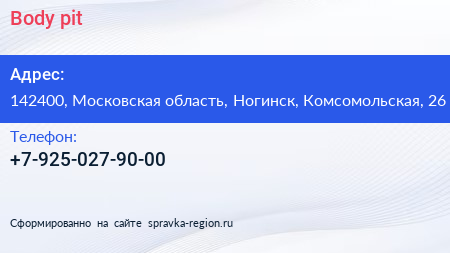 Body-pit по адресу 142400, Московская область, Ногинск, Комсомольская, 26 в дальнейшем Организация, размещена в следующих категориях: