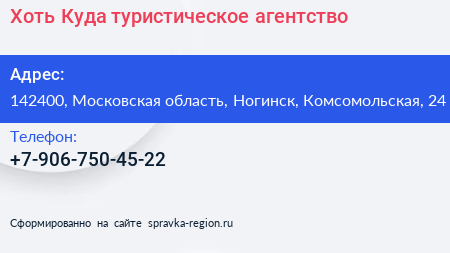 Хоть Куда!, туристическое агентство по адресу 142400, Московская область, Ногинск, Комсомольская, 24 в дальнейшем Организация, размещена в следующих категориях: