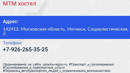 МТМ, хостел по адресу 142412, Московская область, Ногинск, Социалистическая, 2 в дальнейшем Организация, размещена в следующих категориях: