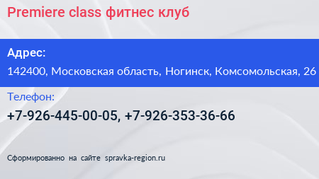 Premiere class, фитнес-клуб по адресу 142400, Московская область, Ногинск, Комсомольская, 26 в дальнейшем Организация, размещена в следующих категориях: