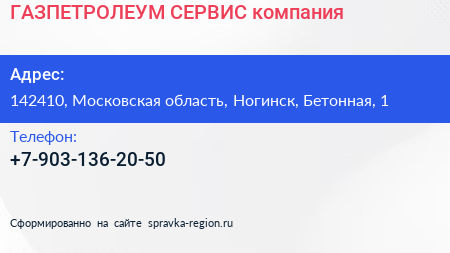 ГАЗПЕТРОЛЕУМ СЕРВИС, компания по адресу 142410, Московская область, Ногинск, Бетонная, 1 в дальнейшем Организация, размещена в следующих категориях: