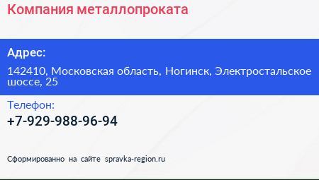 Компания металлопроката по адресу 142410, Московская область, Ногинск, Электростальское шоссе, 25 в дальнейшем Организация, размещена в следующих категориях:
