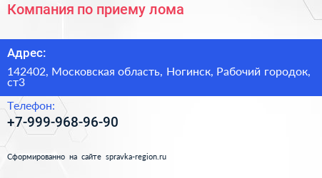 Компания по приему лома по адресу 142402, Московская область, Ногинск, Рабочий городок, ст3 в дальнейшем Организация, размещена в следующих категориях: