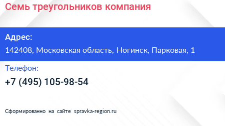 Семь треугольников, компания по адресу 142408, Московская область, Ногинск, Парковая, 1 в дальнейшем Организация, размещена в следующих категориях: