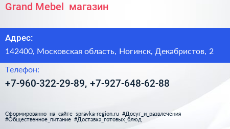 Grand Mebel+, магазин по адресу 142400, Московская область, Ногинск, Декабристов, 2 в дальнейшем Организация, размещена в следующих категориях: