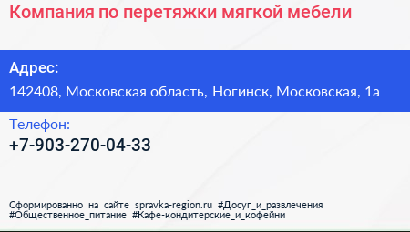 Компания по перетяжки мягкой мебели по адресу 142408, Московская область, Ногинск, Московская, 1а в дальнейшем Организация, размещена в следующих категориях: