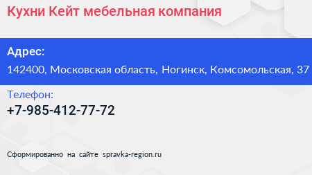 Кухни Кейт, мебельная компания по адресу 142400, Московская область, Ногинск, Комсомольская, 37 в дальнейшем Организация, размещена в следующих категориях: