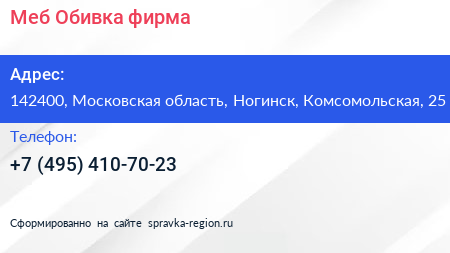 Меб-Обивка, фирма по адресу 142400, Московская область, Ногинск, Комсомольская, 25 в дальнейшем Организация, размещена в следующих категориях: