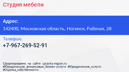 Студия мебели по адресу 142400, Московская область, Ногинск, Рабочая, 28 в дальнейшем Организация, размещена в следующих категориях: