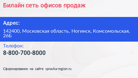 Билайн, сеть офисов продаж по адресу 142400, Московская область, Ногинск, Комсомольская, 26Б в дальнейшем Организация, размещена в следующих категориях: