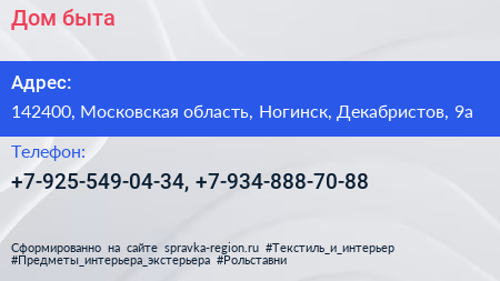 Дом быта по адресу 142400, Московская область, Ногинск, Декабристов, 9а в дальнейшем Организация, размещена в следующих категориях: