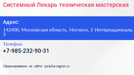 Системный Лекарь, техническая мастерская по адресу 142400, Московская область, Ногинск, 3 Интернационала, 3 в дальнейшем Организация, размещена в следующих категориях:
