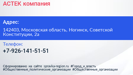 АСТЕК, компания по адресу 142403, Московская область, Ногинск, Советской Конституции, 2а в дальнейшем Организация, размещена в следующих категориях:
