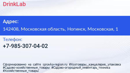 DrinkLab по адресу 142408, Московская область, Ногинск, Московская, 1 в дальнейшем Организация, размещена в следующих категориях: