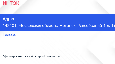 ИНТЭК по адресу 142401, Московская область, Ногинск, Ревсобраний 1-я, 19 в дальнейшем Организация, размещена в следующих категориях: