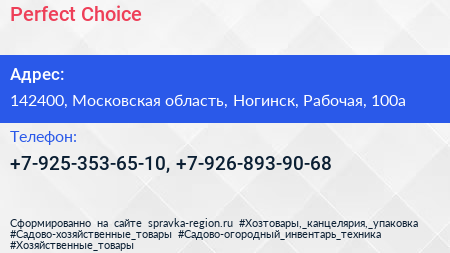 Perfect Choice по адресу 142400, Московская область, Ногинск, Рабочая, 100а в дальнейшем Организация, размещена в следующих категориях: