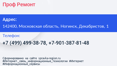 Проф Ремонт по адресу 142400, Московская область, Ногинск, Декабристов, 1 в дальнейшем Организация, размещена в следующих категориях: