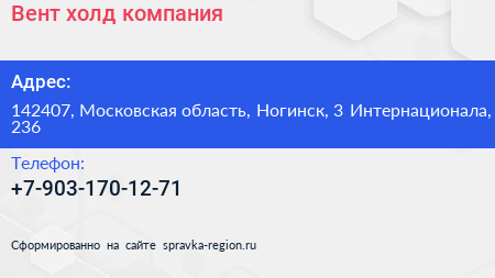 Вент-холд, компания по адресу 142407, Московская область, Ногинск, 3 Интернационала, 236 в дальнейшем Организация, размещена в следующих категориях:
