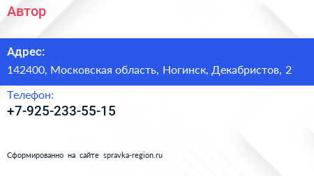 Автор по адресу 142400, Московская область, Ногинск, Декабристов, 2 в дальнейшем Организация, размещена в следующих категориях: