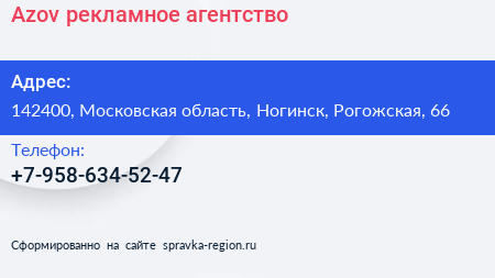 Azov, рекламное агентство по адресу 142400, Московская область, Ногинск, Рогожская, 66 в дальнейшем Организация, размещена в следующих категориях: