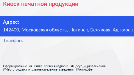 Киоск печатной продукции по адресу 142400, Московская область, Ногинск, Белякова, 4д киоск в дальнейшем Организация, размещена в следующих категориях: