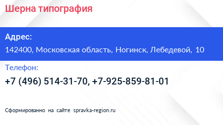 Шерна, типография по адресу 142400, Московская область, Ногинск, Лебедевой, 10 в дальнейшем Организация, размещена в следующих категориях: