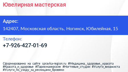 Ювелирная мастерская по адресу 142407, Московская область, Ногинск, Юбилейная, 15 в дальнейшем Организация, размещена в следующих категориях: