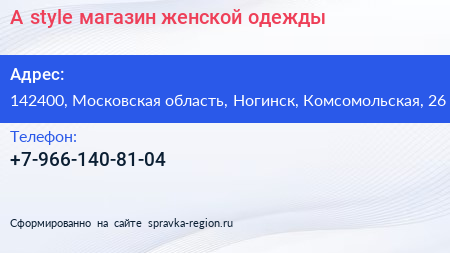 A-style, магазин женской одежды по адресу 142400, Московская область, Ногинск, Комсомольская, 26 в дальнейшем Организация, размещена в следующих категориях: