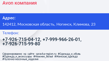 Avon, компания по адресу 142412, Московская область, Ногинск, Климова, 23 в дальнейшем Организация, размещена в следующих категориях: