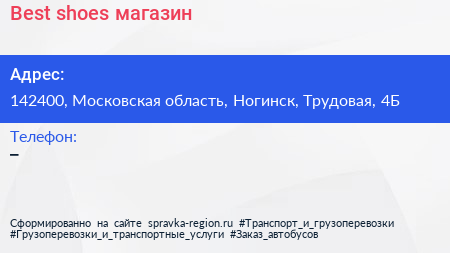 Best shoes, магазин по адресу 142400, Московская область, Ногинск, Трудовая, 4Б в дальнейшем Организация, размещена в следующих категориях: