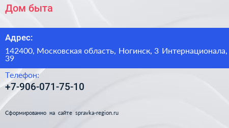 Дом быта по адресу 142400, Московская область, Ногинск, 3 Интернационала, 39 в дальнейшем Организация, размещена в следующих категориях: