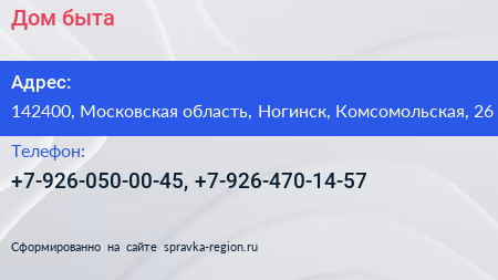 Дом быта по адресу 142400, Московская область, Ногинск, Комсомольская, 26 в дальнейшем Организация, размещена в следующих категориях: