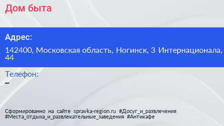 Дом быта по адресу 142400, Московская область, Ногинск, 3 Интернационала, 44 в дальнейшем Организация, размещена в следующих категориях: