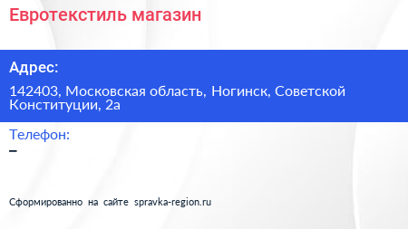 Евротекстиль, магазин по адресу 142403, Московская область, Ногинск, Советской Конституции, 2а в дальнейшем Организация, размещена в следующих категориях: