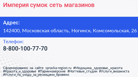 Империя сумок, сеть магазинов по адресу 142400, Московская область, Ногинск, Комсомольская, 26 в дальнейшем Организация, размещена в следующих категориях: