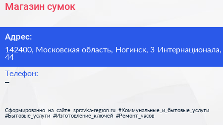 Магазин сумок по адресу 142400, Московская область, Ногинск, 3 Интернационала, 44 в дальнейшем Организация, размещена в следующих категориях: