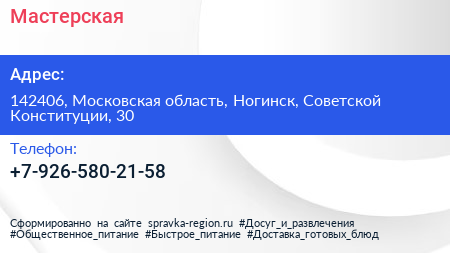 Мастерская по адресу 142406, Московская область, Ногинск, Советской Конституции, 30 в дальнейшем Организация, размещена в следующих категориях: