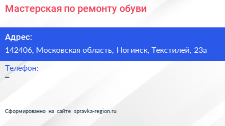 Мастерская по ремонту обуви по адресу 142406, Московская область, Ногинск, Текстилей, 23а в дальнейшем Организация, размещена в следующих категориях: