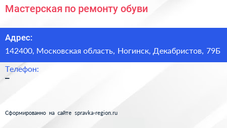 Мастерская по ремонту обуви по адресу 142400, Московская область, Ногинск, Декабристов, 79Б в дальнейшем Организация, размещена в следующих категориях: