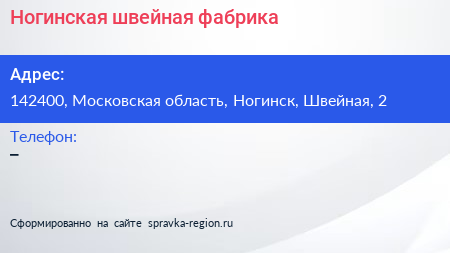 Ногинская швейная фабрика по адресу 142400, Московская область, Ногинск, Швейная, 2 в дальнейшем Организация, размещена в следующих категориях: