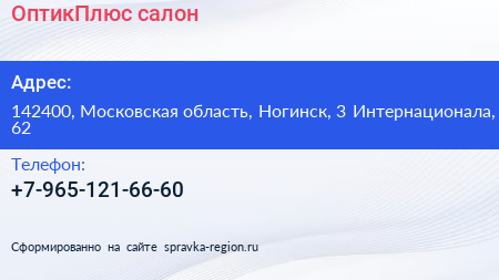 ОптикПлюс, салон по адресу 142400, Московская область, Ногинск, 3 Интернационала, 62 в дальнейшем Организация, размещена в следующих категориях: