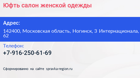 Юфть, салон женской одежды по адресу 142400, Московская область, Ногинск, 3 Интернационала, 62 в дальнейшем Организация, размещена в следующих категориях: