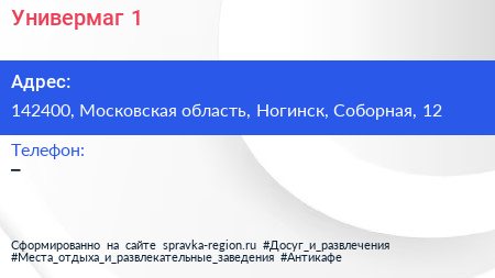 Универмаг №1 по адресу 142400, Московская область, Ногинск, Соборная, 12 в дальнейшем Организация, размещена в следующих категориях: