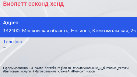 Виолетт, секонд-хенд по адресу 142400, Московская область, Ногинск, Комсомольская, 25 в дальнейшем Организация, размещена в следующих категориях: